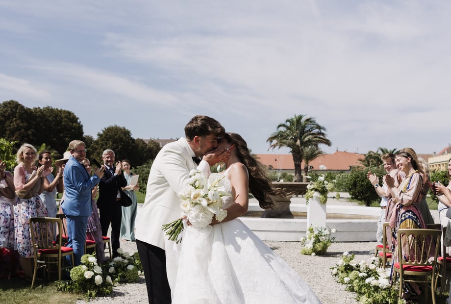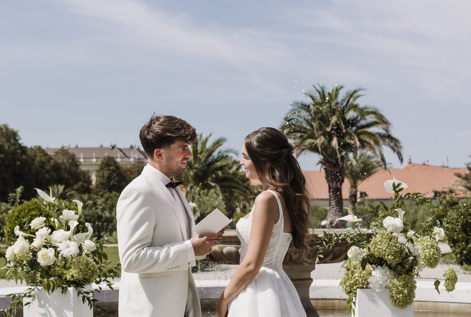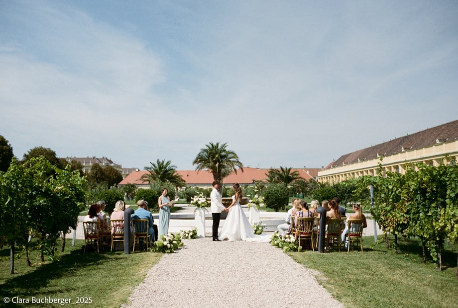 Im Orangeriegarten, idyllisch zwischen Weinreben gelegen und mit Blick bis zum Schloss, wird Ihre Trauung zu einem besonderen Erlebnis. Palmen, ein plätschernder Brunnen und die warme Atmosphäre des Gartens schaffen den perfekten Rahmen für Ihr Ja-Wort.