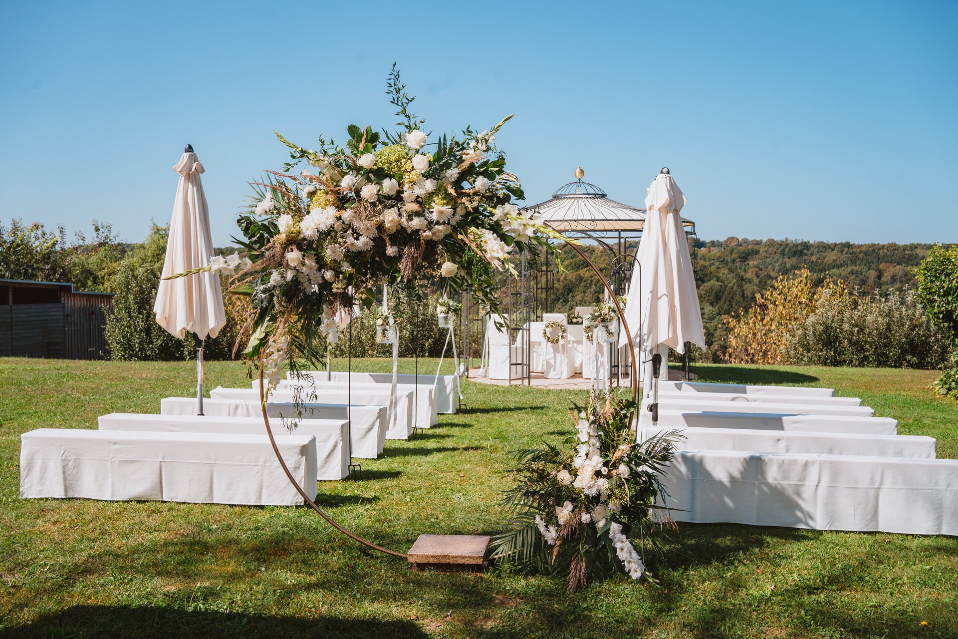 Bei schönem Wetter laden der idyllische Arkadenhof und die Terrasse zum Empfang oder sogar zur Trauung im Freien ein. Eine standesamtliche Trauung auf der Terrasse ist hier ebenfalls möglich – so wird Ihr besonderer Tag noch persönlicher.
