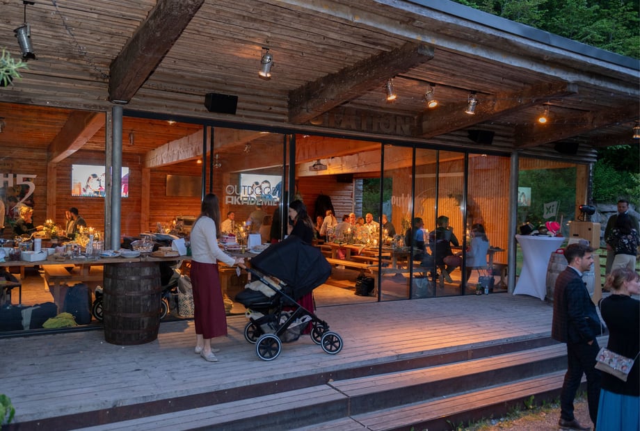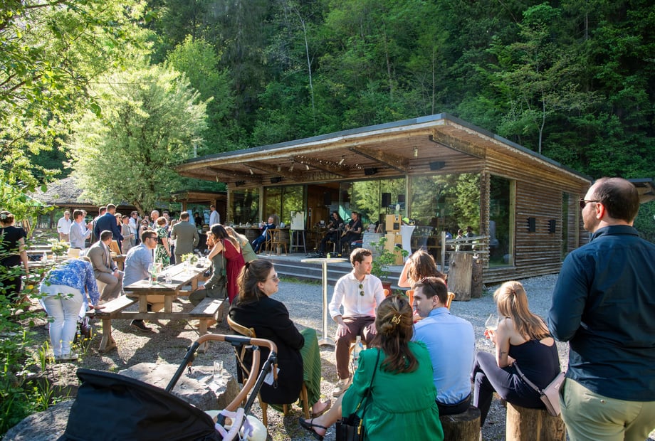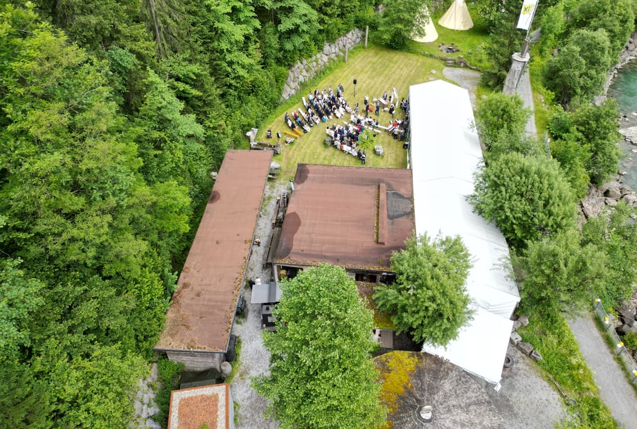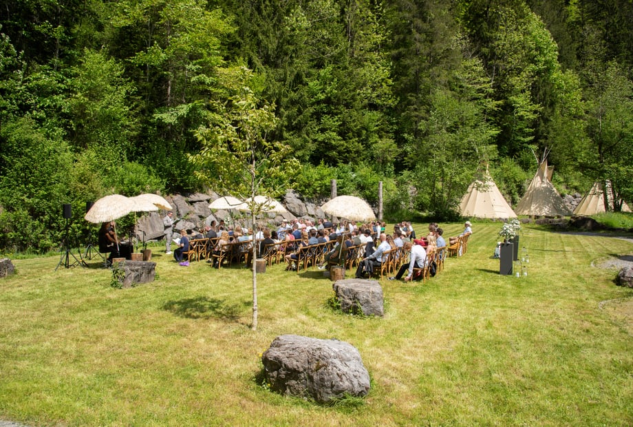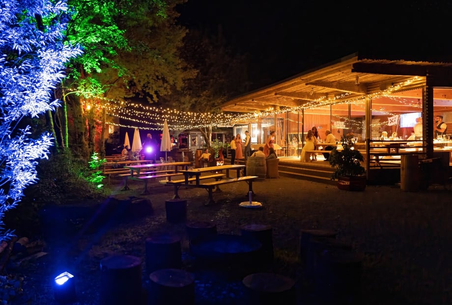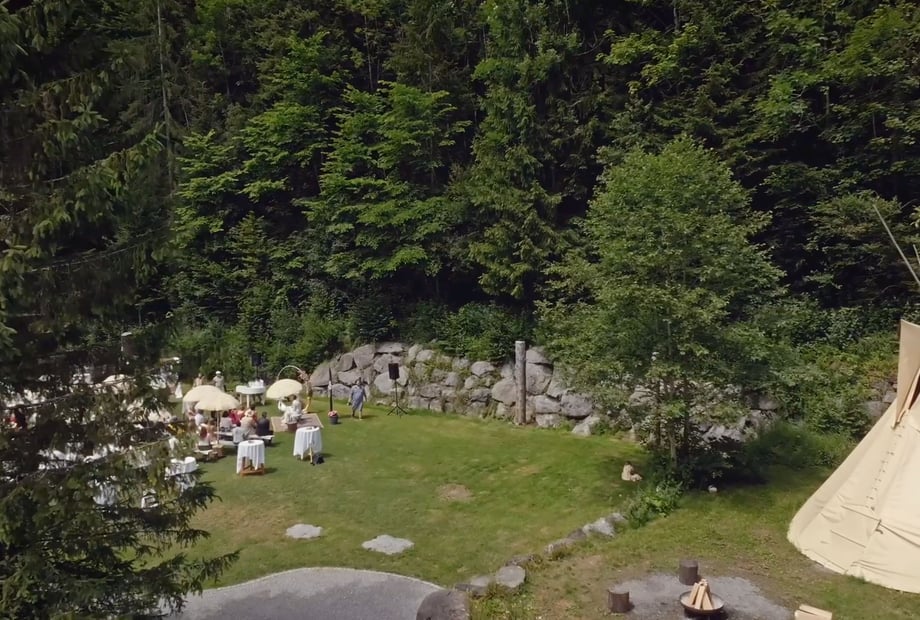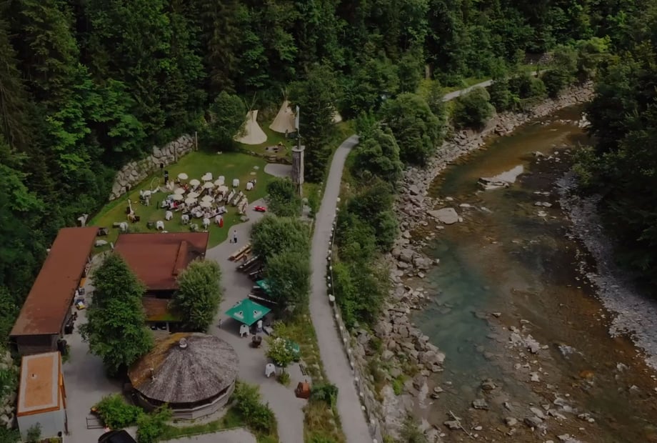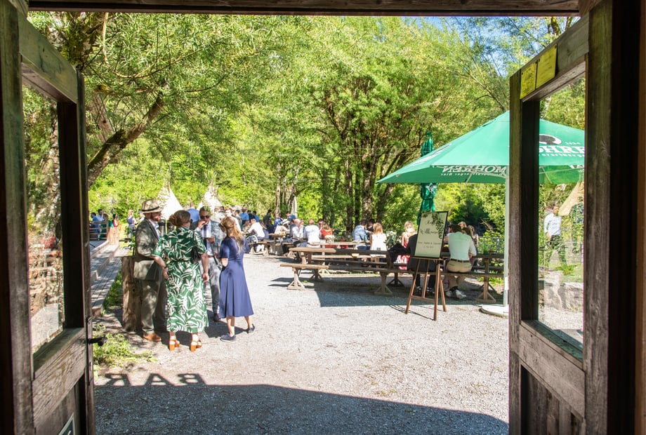 Das H an der Ach bietet Platz für bis zu 120 Gäste – und bei Bedarf sogar für bis zu 220, dank zusätzlicher Zelte. Das Highlight ist die „Hochzeitswiese“: ein idyllischer Ort direkt am Wasser, umgeben von saftigem Grün und einer beeindruckenden Felswand – perfekt für Ihre freie Trauung. Für die Feier steht die wetterfeste „Station“ bereit, ausgestattet mit einer Tanzfläche für 100 Personen sowie moderner Technik für Musik und Präsentationen. Die „Kaituna Bar“ und gemütliche Tipis schaffen eine entspannte, abenteuerliche Stimmung, die Ihre Hochzeit besonders macht.