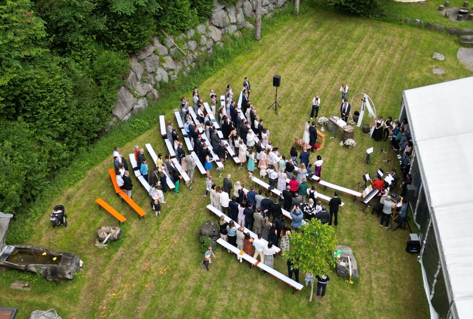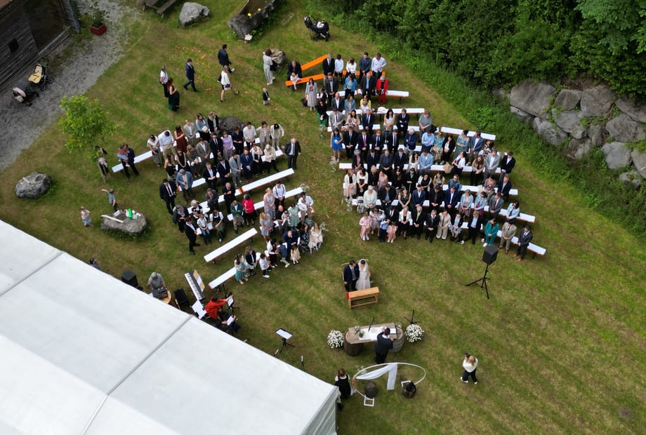 Ja, wir haben auf unserer Hochzeitswiese Platz für eine freie Trauung und auch für die Hochzeitsfeier haben wir genügend Platz für eure Gäste. Als Standard bieten wir euch Sitzbänke mit weissen Hussen für bis zu 120 Gäste.