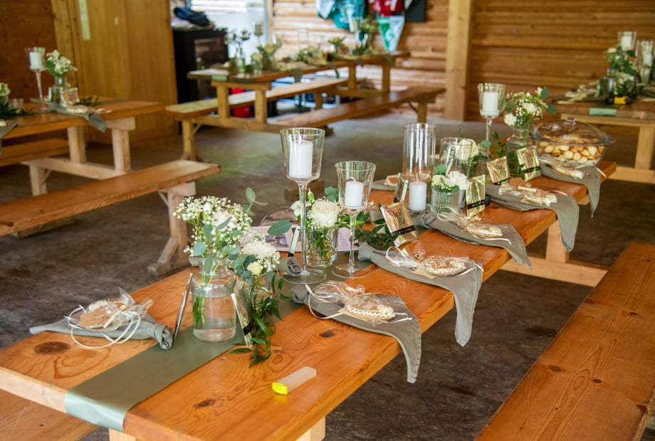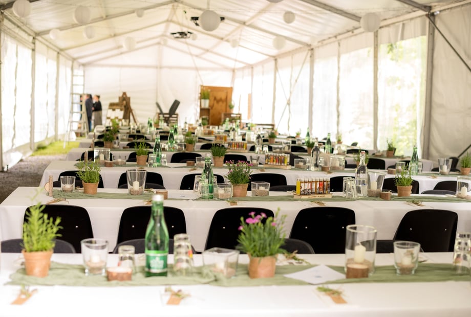 Bei uns können ohne zusätzliche Zelte bis zu 120 Personen feiern, mit Zusatzzelten bis zu 250 Personen.