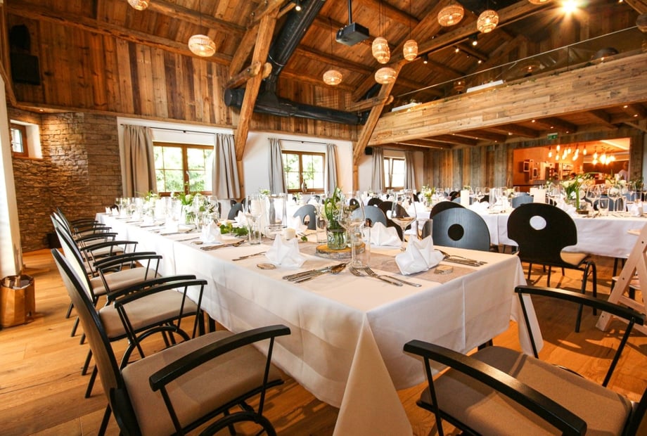 Das Landhotel Laudersbach passt sich ganz Ihren Wünschen an. Im Mittelpunkt steht der Hochzeitsstadl – eine liebevoll restaurierte Scheune, die historischen Flair mit moderner Technik verbindet. Hier finden bis zu 120 Gäste Platz für ein festliches Dinner und ausgelassene Feiern. Für kleinere, intime Runden bieten die gemütlichen Stuben im Gasthof Raum für bis zu 40 Personen. Der Empfang kann im idyllischen Innenhof oder auf der Gartenterrasse stattfinden – so haben Sie für jeden Moment den passenden Ort.