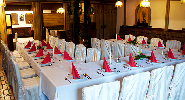 Für größere Gesellschaften bietet der Festsaal Raum für bis zu 160 Gäste und lässt sich mit dem Wintergarten kombinieren.