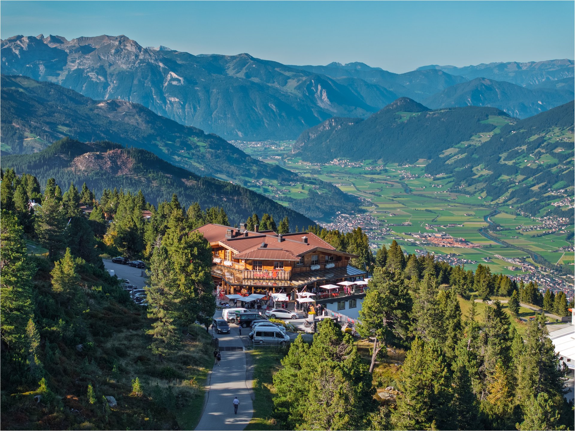 Die Rössl Alm liegt auf ca. 1.580 m Höhe über Gerlos im Zillertal (Tirol, Österreich) mit spektakulärer Aussicht über Alpen, Wälder und Wiesen.