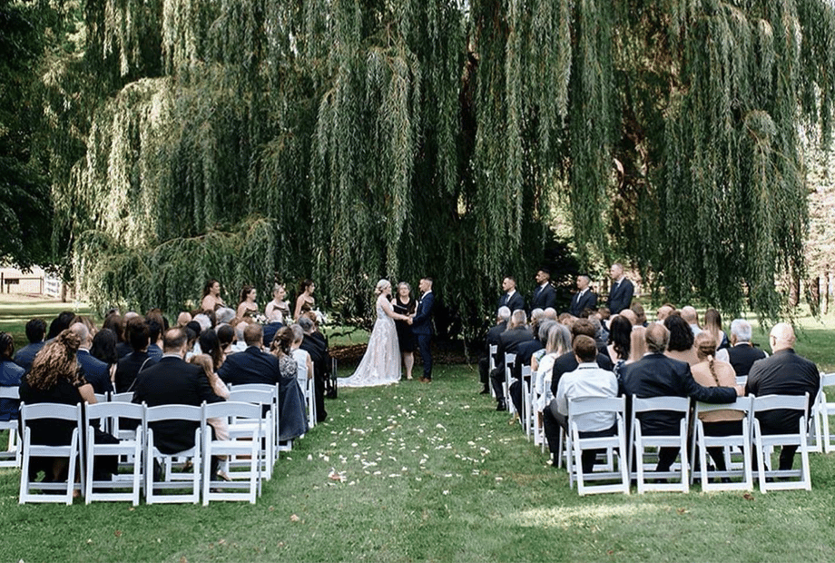 The Garden Tent combines the charm of an outdoor wedding with the elegance of a ballroom. It has picturesque views nearby for your wedding photos, including the pond, covered bridge, water fountain, and more.