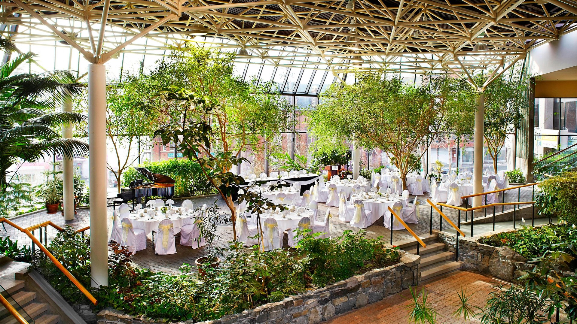 The capacity is between 100 and 500 guests, indoors in the multi-level main room with wheel-chair accessibility. Additional venue features are: