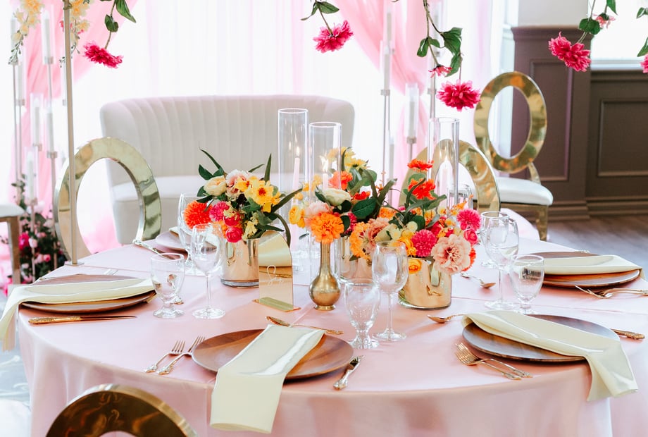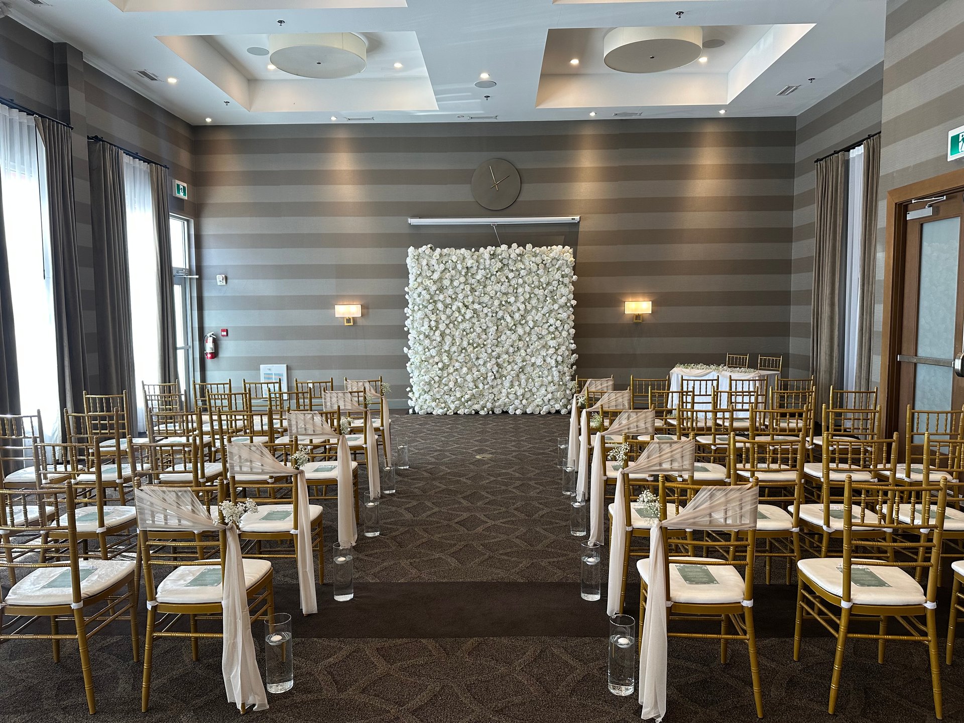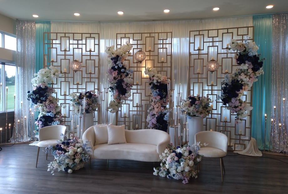 We can provide linens, chair covers, tables and chiavari chairs*. You are free to hire your choice of decorator for items such as centrepieces, head table décor, backdrop, mandap, ceremony backdrop, aisle runner and flowers.