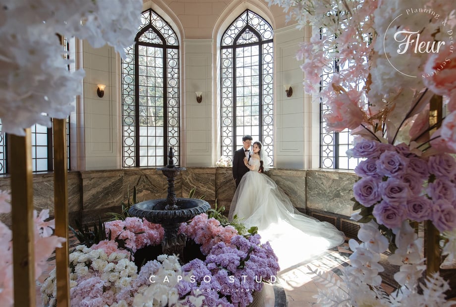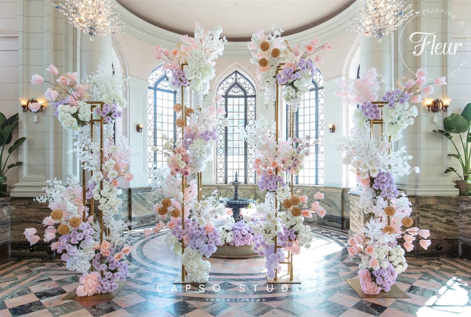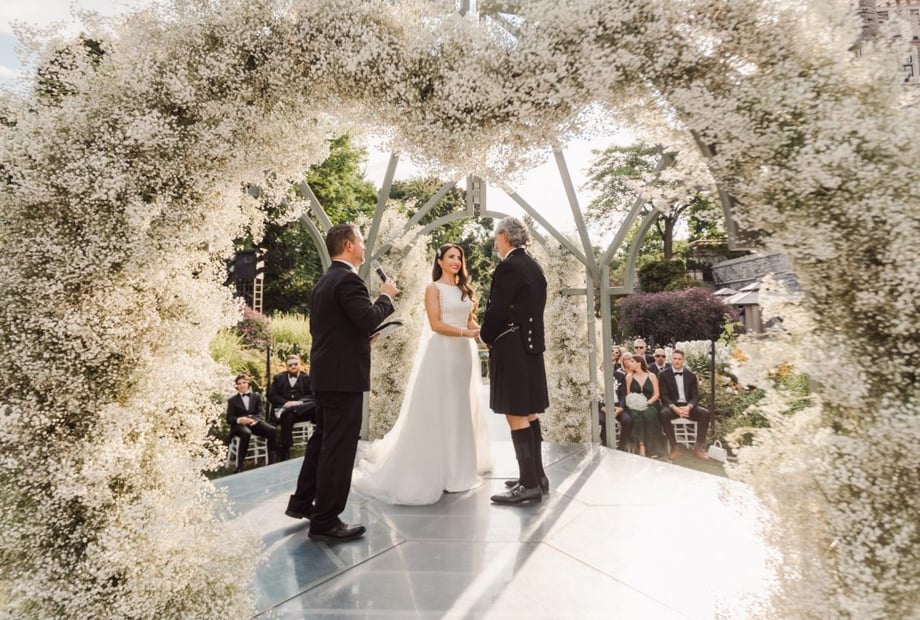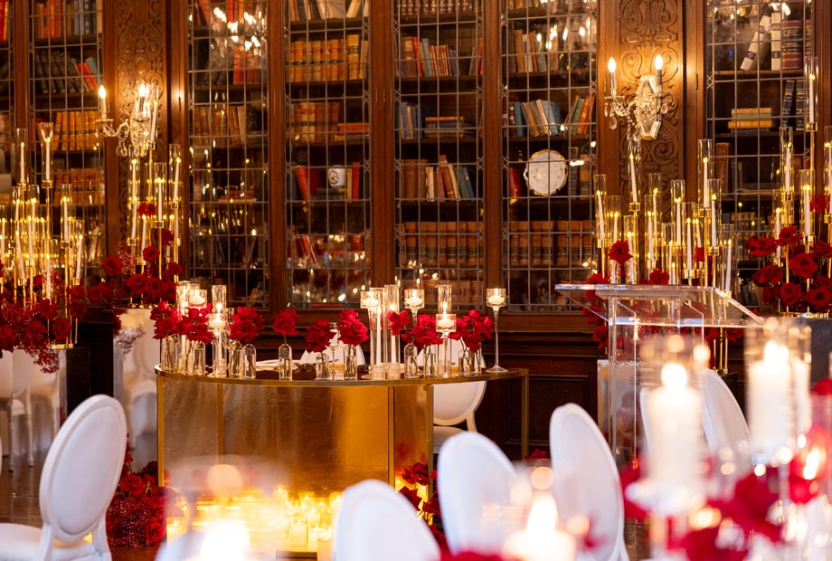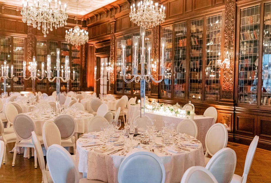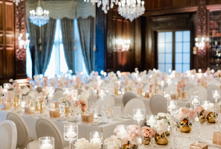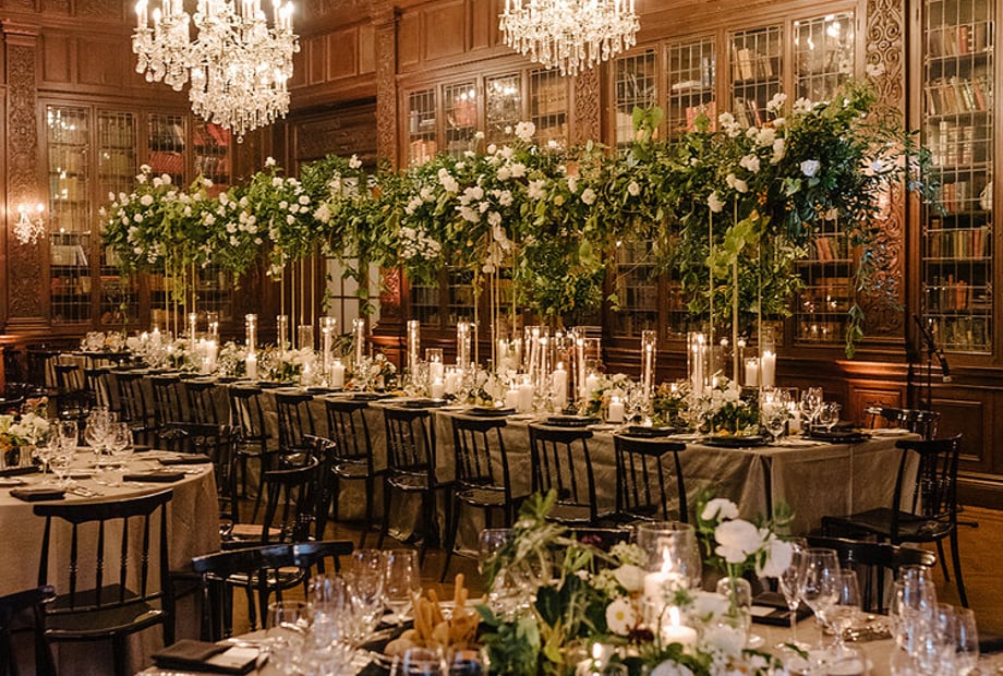 The ceremony happens outdoors in the gardens, on the terrace or indoors in the Great Hall with a 60 ft ceiling. Other rooms can also be set for your nuptials. Lavish fountains with unique sculptures and rare flowers are gorgeous backdrops for photos and ceremonies for 250 ceremony guests.