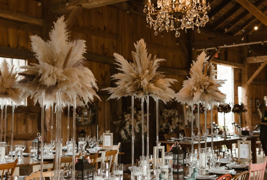 The Century Barn provides a warm elegant setting for your reception, harvest tables with mismatched antique wooden chairs, vintage tableware and grand chandeliers
