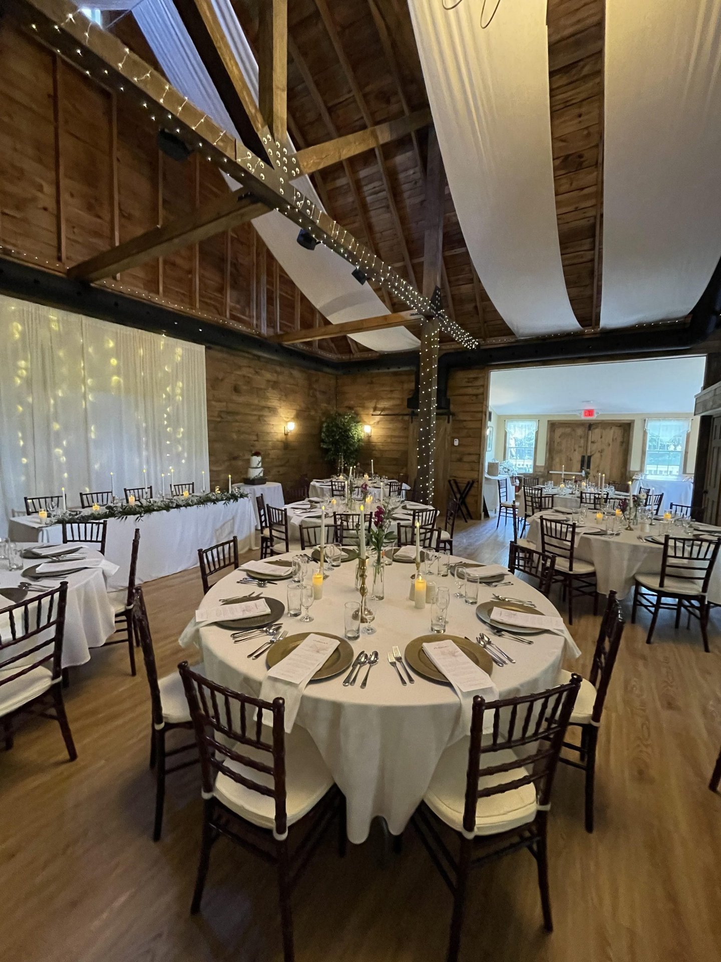 It is equipped with banquet tables, white chiavari chairs, a bar, fridges, and water coolers and includes a kitchen prep area with extra tables.