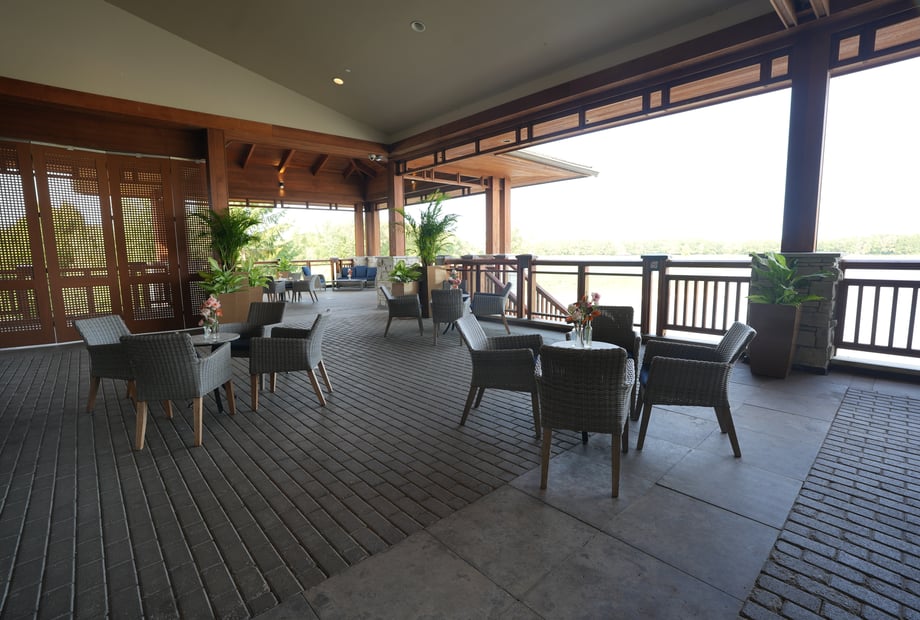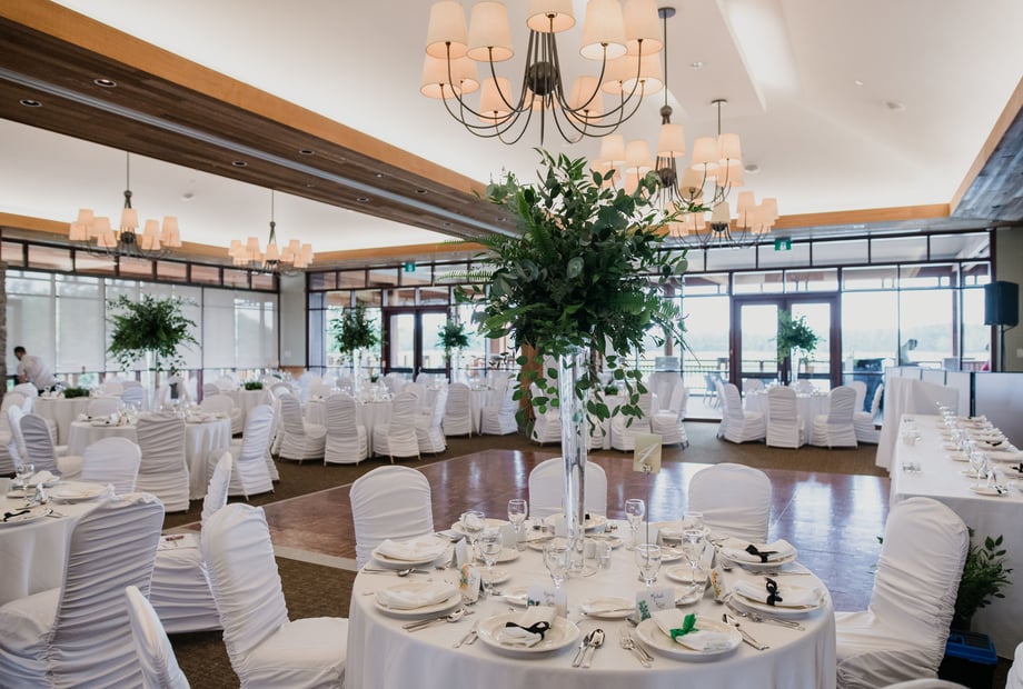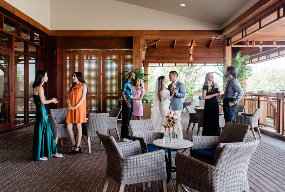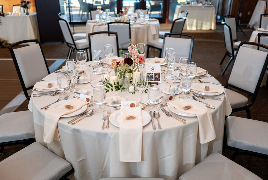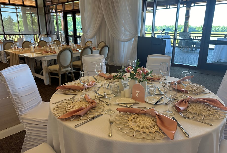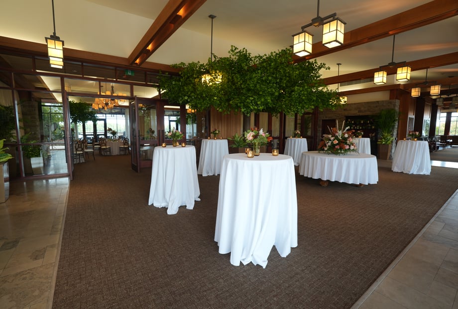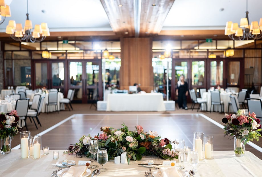 Your celebration continues at the venue’s iconic reception room. The building’s warm and inviting design features a beautiful expansive terrace, offering panoramic views of the Battlefield course and shimmering lake. As the sun sets over the rolling greens, your guests can enjoy cocktails and conversation amidst one of the most scenic backdrops in the region. This unique architectural style, paired with dramatic natural vistas, creates an atmosphere that is both distinctive and deeply romantic—perfect for receptions for up to 200 guests.
