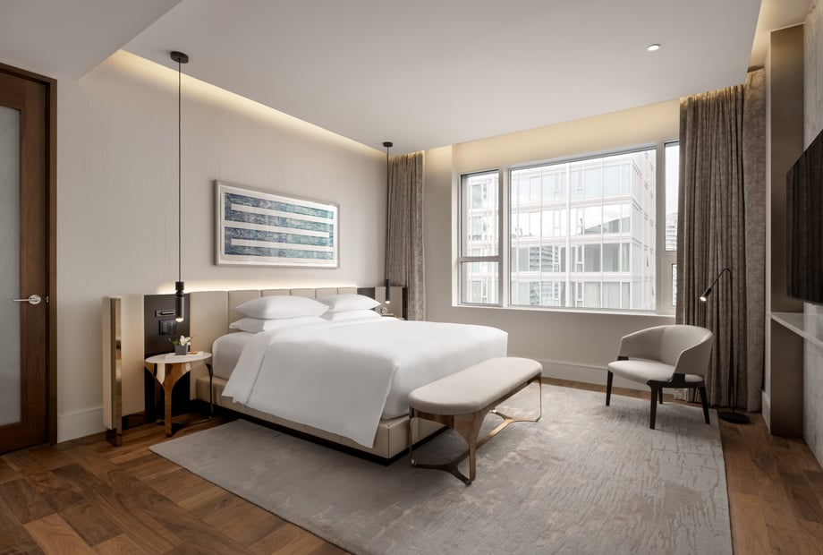 Luxurious Accommodations for Your Guests Your guests can retreat to cozy accommodations at Park Hyatt Toronto, with a range of suites available including Bi-level, Algonquin, deluxe, standard, and regular suites. Each room features a plush pillow top mattress, feather duvet, big flatscreen TV, free wifi, minibar, and work desk. After a day of exploring the city, guests can unwind in the comfort of their luxurious suites and enjoy 24-hour room service for dining in privacy. Plan your dream wedding at Park Hyatt Toronto and experience a magical celebration in the heart of Toronto.