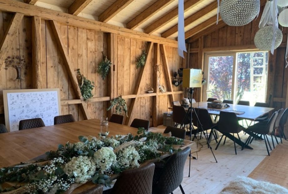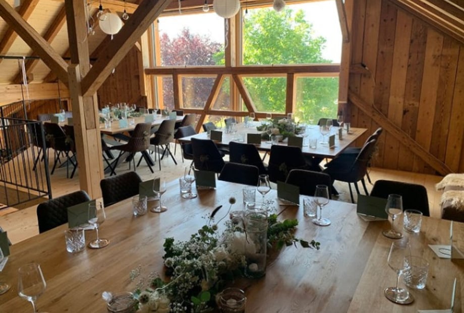 - Eventscheune: Die helle, klimatisierte Hauptscheune mit Galerie bietet Platz für bis zu 120 sitzende Gäste. Ausgestattet mit moderner Licht- und Tontechnik sowie Beamer, ist sie ideal für eure Zeremonie, das Dinner und die Party. Für Empfänge können bis zu 200 Gäste stehen.