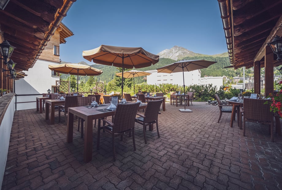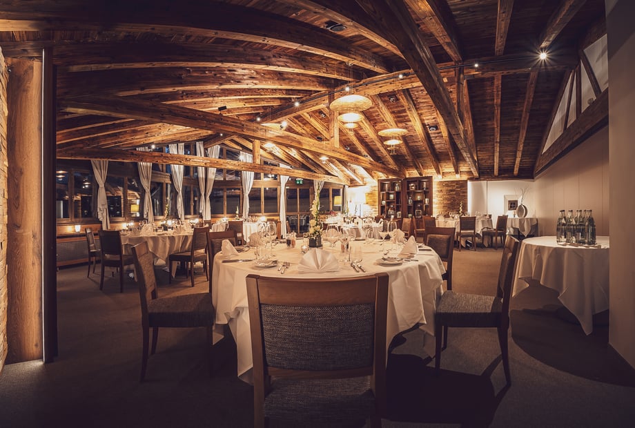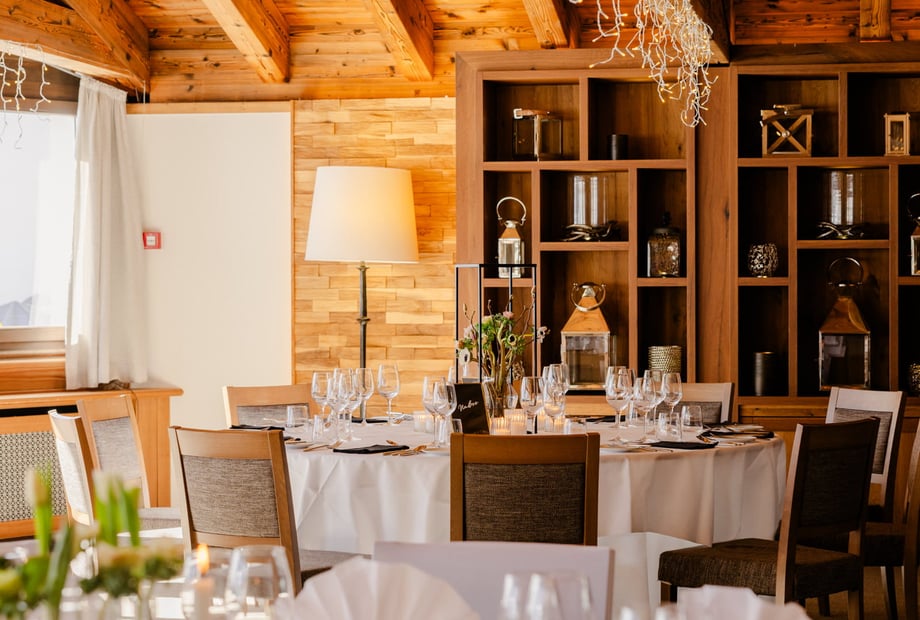 Das Hotel Waldhuus überzeugt mit modernen, im Chalet-Stil gestalteten Räumen, die durch große Fensterfronten viel Tageslicht hereinlassen und direkten Zugang zur Terrasse bieten. Die kombinierbaren Säle „Sertig & Dischma“ bieten auf insgesamt 190 m² Platz für bis zu 120 Gäste und lassen sich flexibel an die Größe Ihrer Gesellschaft anpassen. Die warmen Holzelemente schaffen eine einladende Atmosphäre, die perfekt zu einer Hochzeitsfeier passt. Besonders praktisch: Für Hochzeitsfeiern entfällt die Raummiete, und Beamer sowie Leinwand stehen Ihnen kostenfrei zur Verfügung.