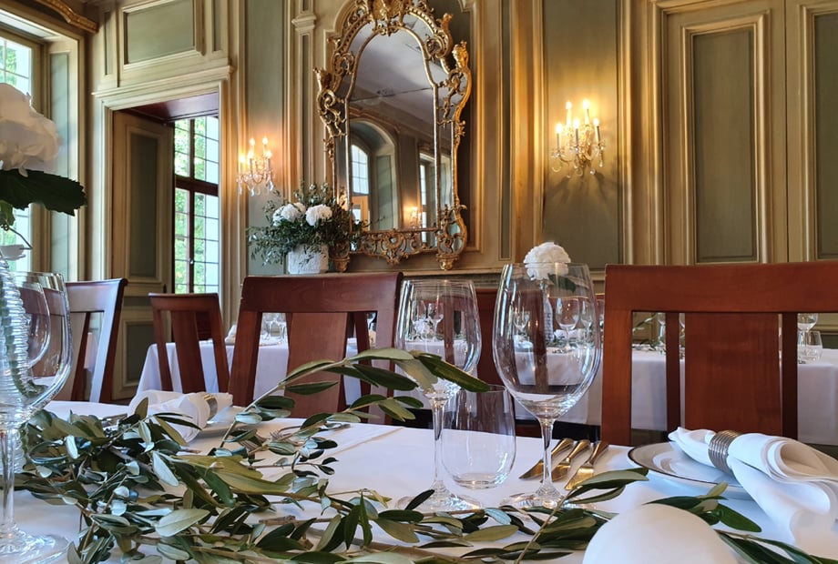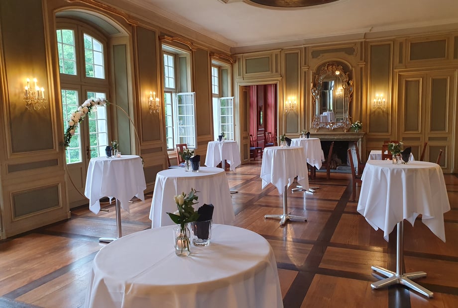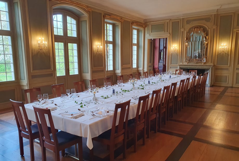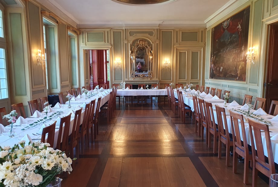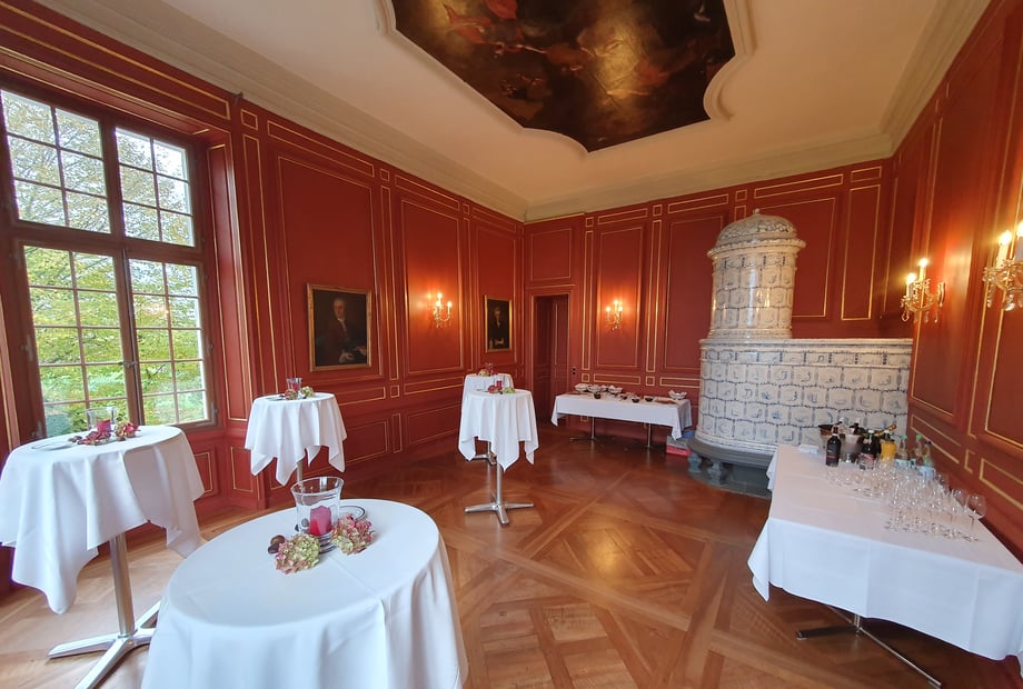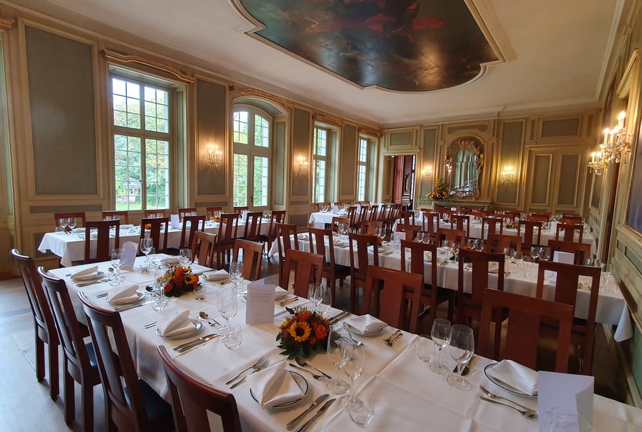 - Festsaal: Das Prunkstück des Schlosses mit beeindruckenden Wand- und Deckenmalereien. Ideal für ein Bankett mit bis zu 72 sitzenden Gästen oder eine Konzertbestuhlung für bis zu 100 Personen. Der Festsaal öffnet sich direkt zum wunderschönen Schlosspark – perfekt für Pausen an der frischen Luft.