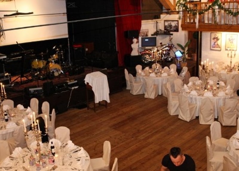 Kuhstall in der Nähe von Hamburg: Der umgebaute Kuhstall verfügt über ein geräumiges Interieur und bietet in gemütlicher Atmosphäre Platz für bis zu 120 Gäste. Auch hier gibt es einen schönen Garten für Zeremonien und Empfänge im Freien.