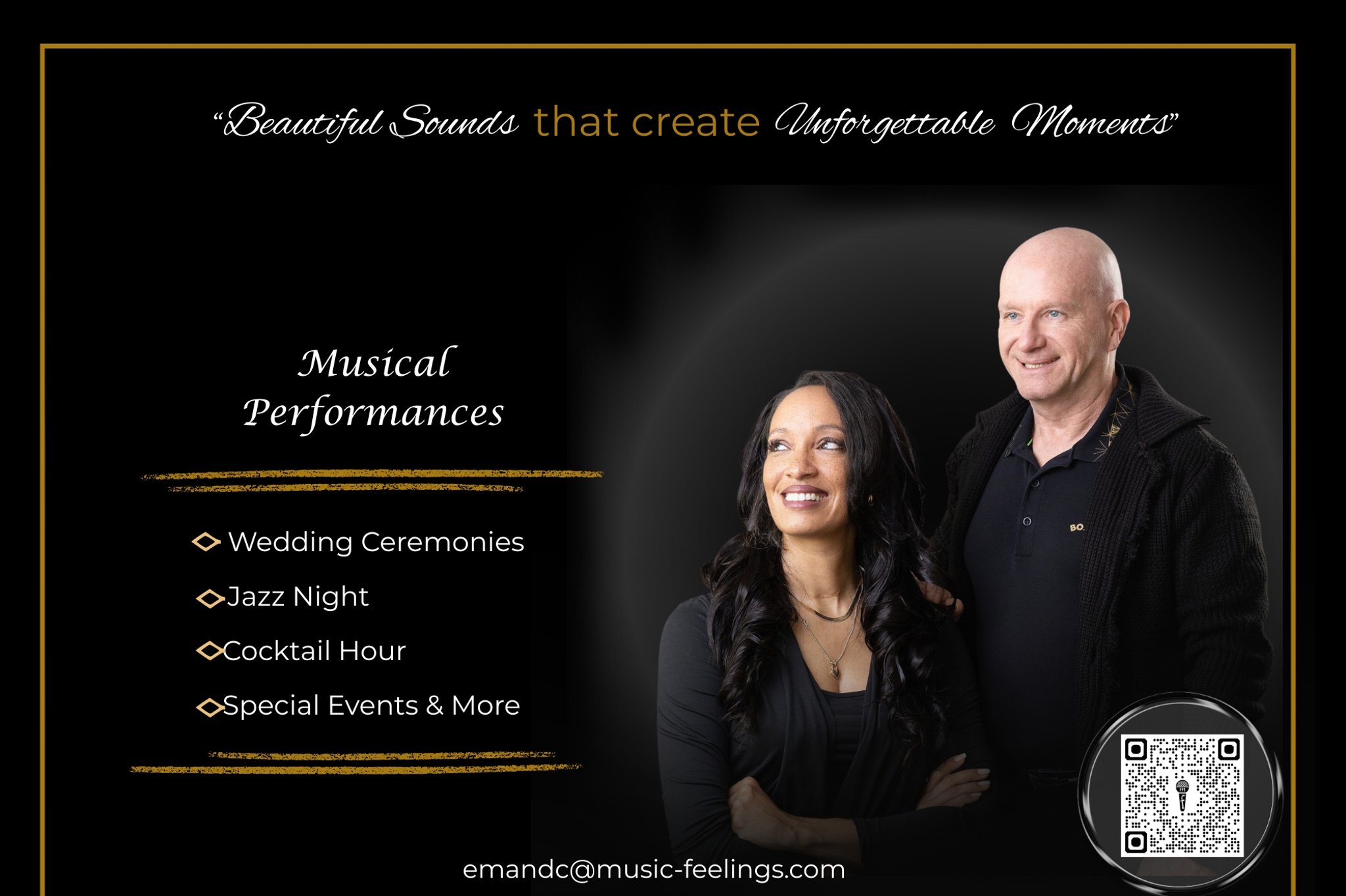 A dynamic vocal and pianist duo offering refined live music for weddings and special events. Featuring a smooth yet powerful vocal presence complemented by beautifully layered piano melodies, we create a meaningful and memorable atmosphere through timeless songs, smooth harmonies, and heartfelt delivery.