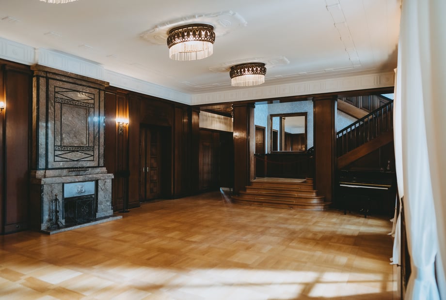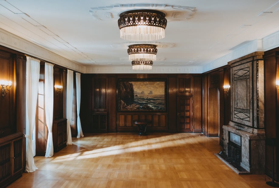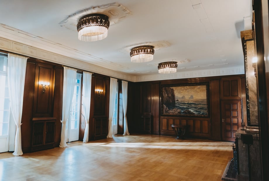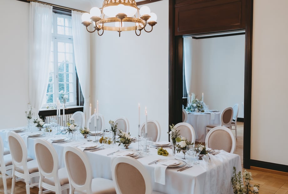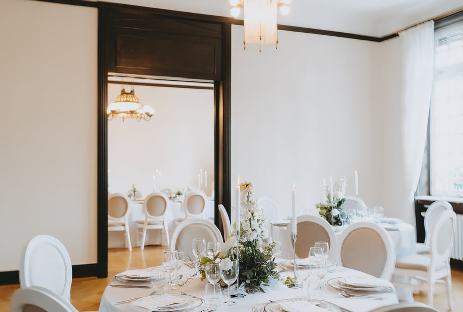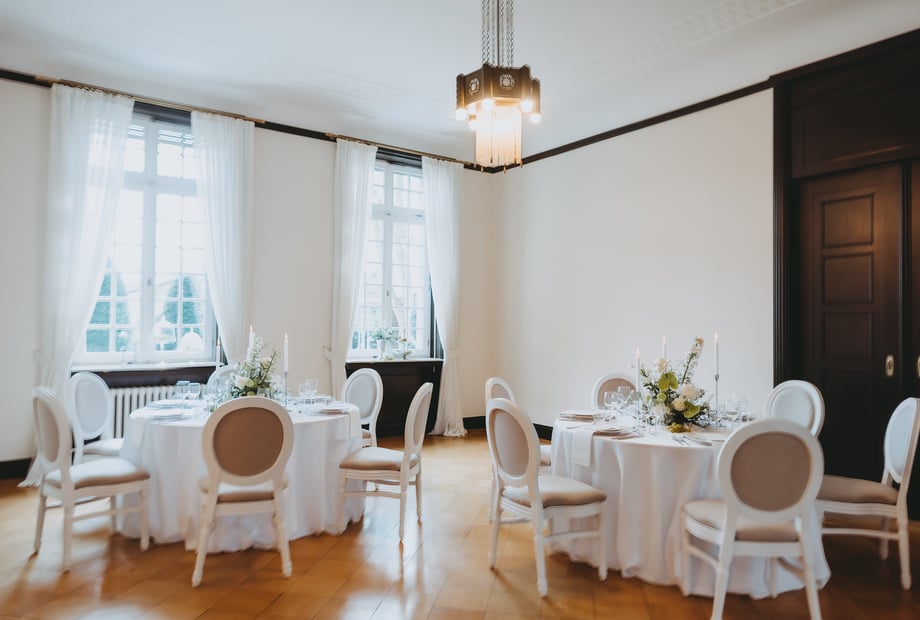 Im Innenbereich der Villa Weißer Berg können bis zu 100 Gäste bequem sitzen. Dadurch eignet sich die Location ideal für stilvolle Hochzeiten und Feiern in besonderer Atmosphäre.
