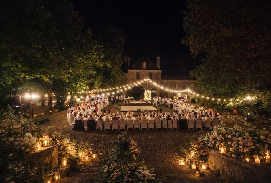 A cocktail reception follows in the heart of the grounds, a champagne toast by the moat, and then a refined dinner in the interior courtyard, illuminated by hanging garlands.