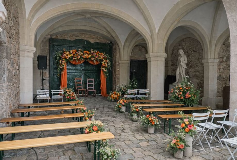 Outdoors, the magic comes to life: a ceremony beneath the trees, a champagne toast by the moats, dinner in the inner courtyard under twinkling lights, and an open-air dance floor surrounded by nature — with the evening ending in the Orangery.