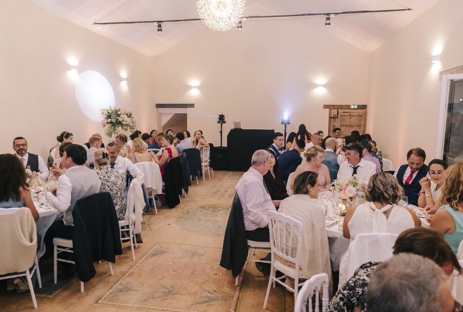 Après la cérémonie, un cocktail a eu lieu sur la terrasse panoramique, avec une vue imprenable sur le domaine, accompagné de musique live et d'animations lumineuses. Le dîner, organisé dans la salle Perciers, a révélé une décoration féerique : guirlandes scintillantes, chandeliers raffinés, et une table ornée de fleurs fraîches.