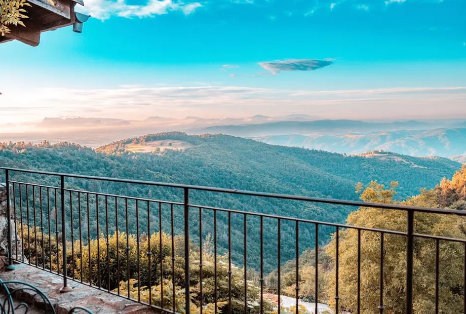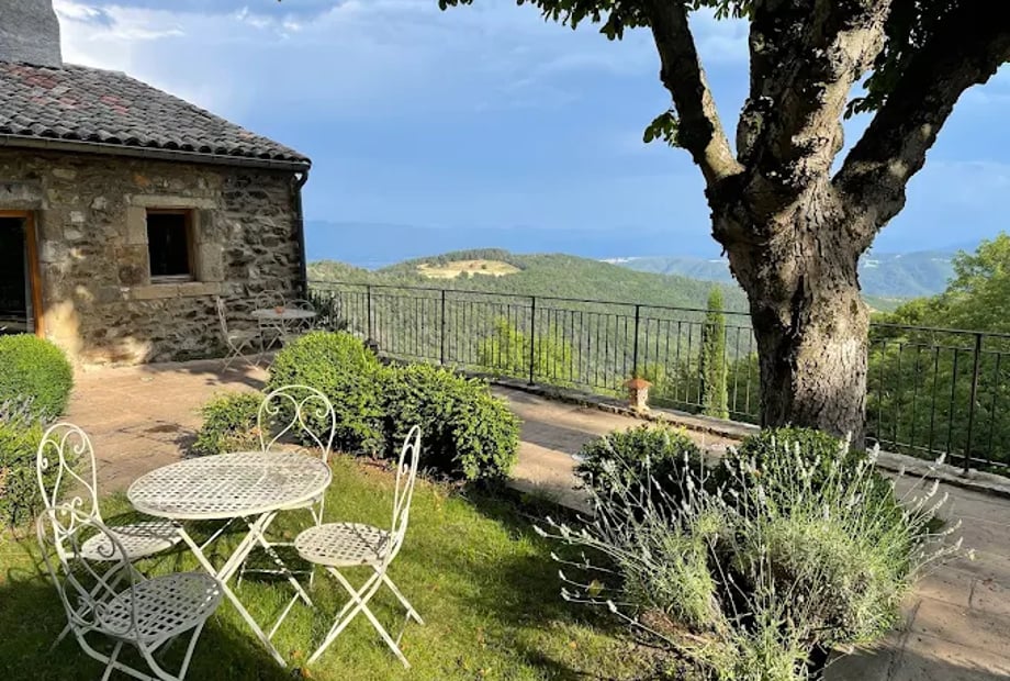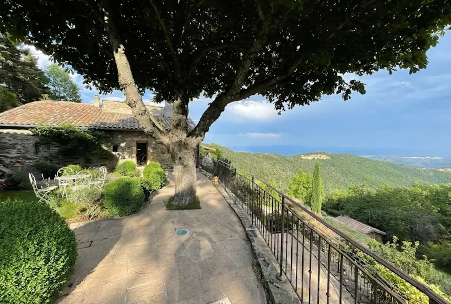 The panoramic terrace with breathtaking views of the Ardèche landscapes, particularly magical at sunset.