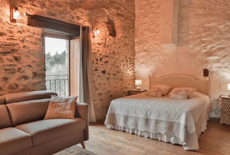 The exteriors with views of the hills, the terrace at sunset and the stone facades of the hamlet offer a natural and authentic setting.