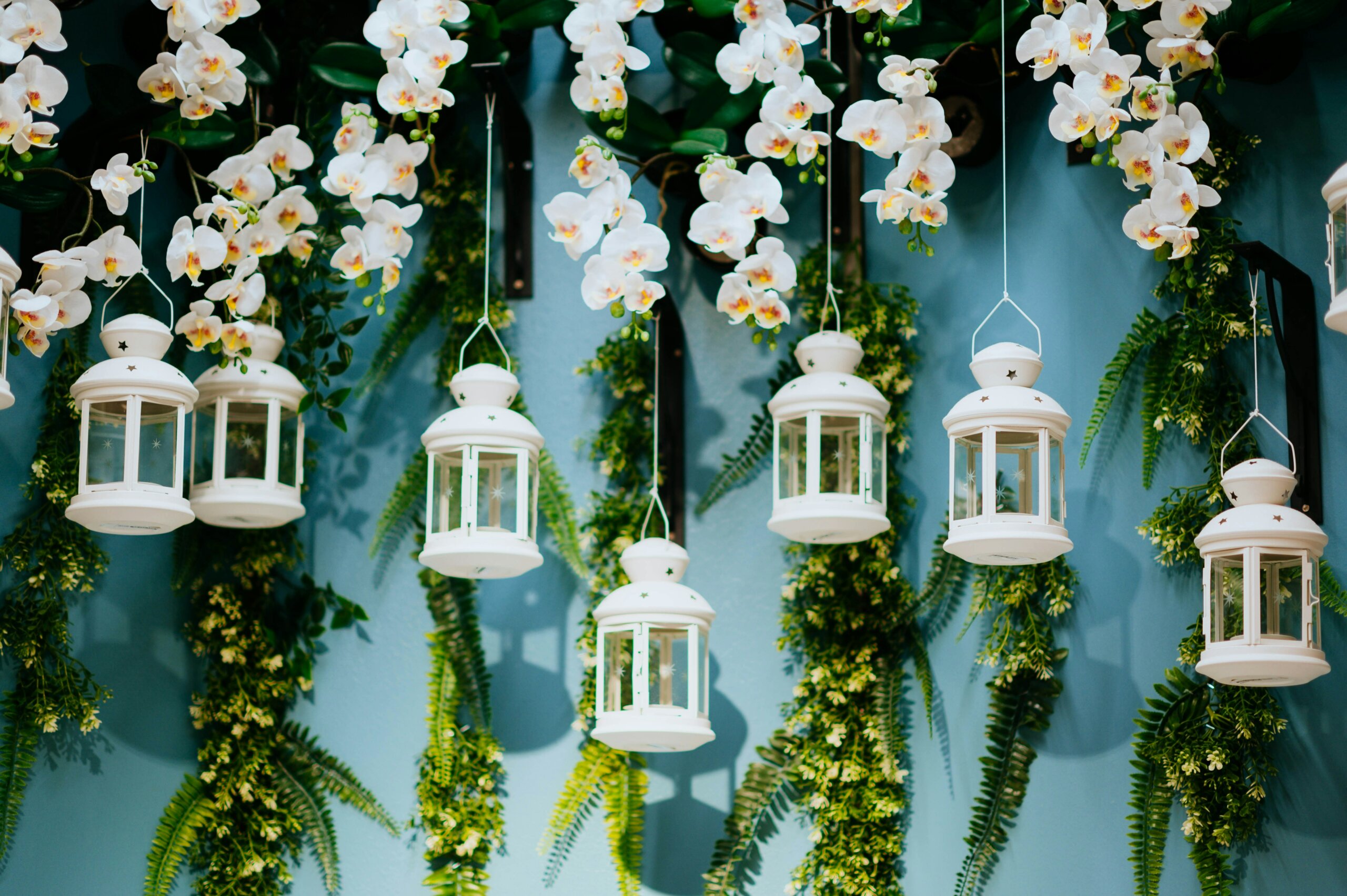 Commencez par habiller les murs avec des rideaux lumineux : faciles à installer, ils créent un fond féérique pour les photos ou pour mettre en valeur la table des mariés. Pour le plafond, pensez végétation suspendue, lanternes en papier ou guirlandes de lampions qui diffusent une lumière douce et chaleureuse.