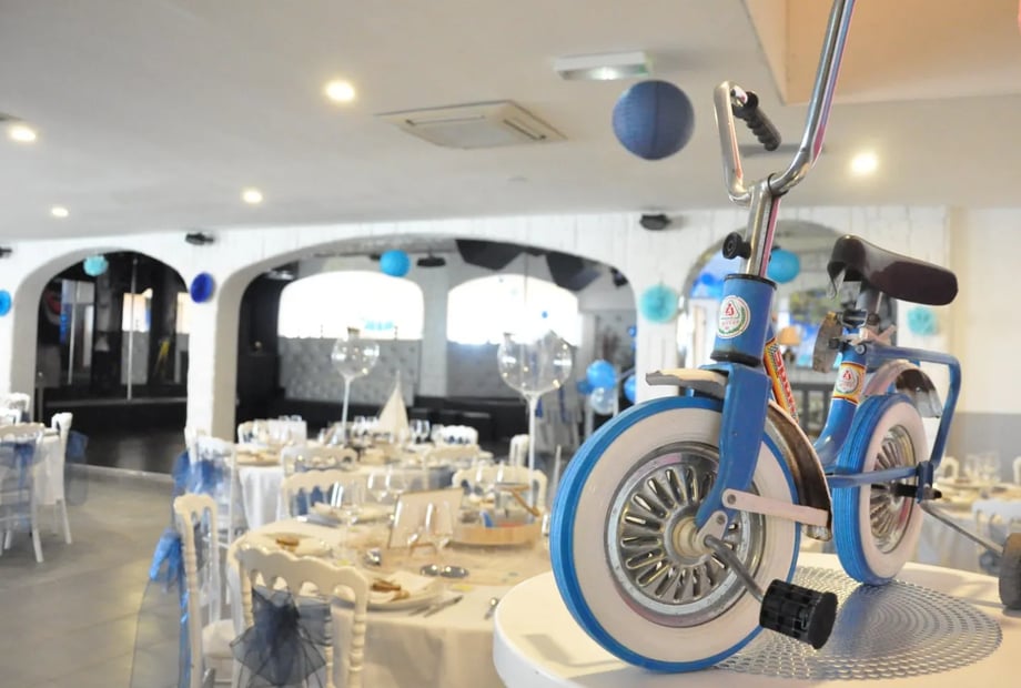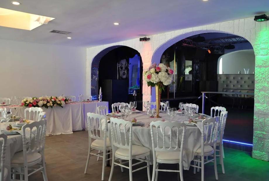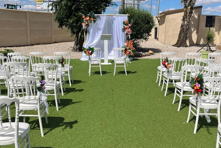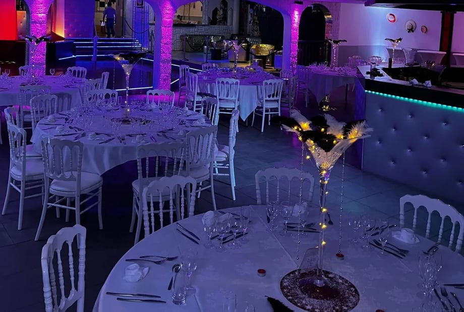• Mobilier élégant : Tables rondes et rectangulaires, ainsi que des chaises blanches style Napoléon III, sont fournies pour un décor raffiné.