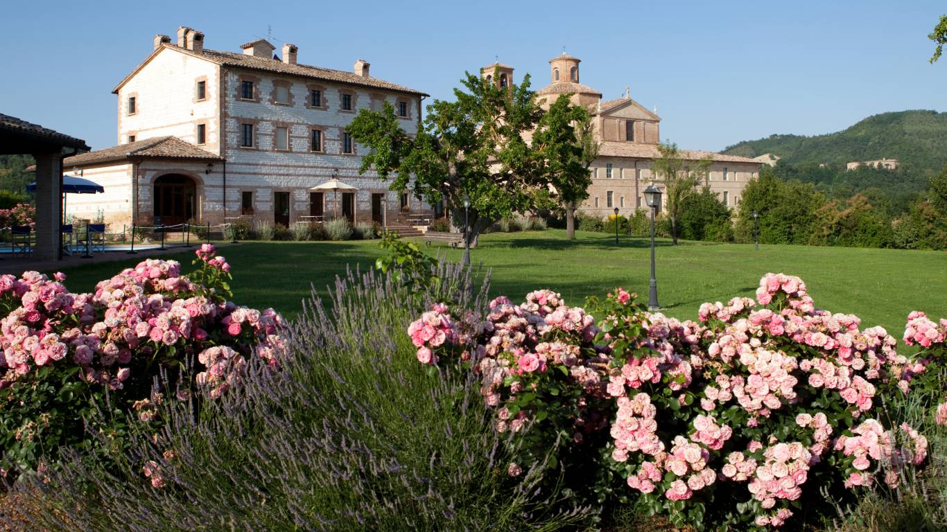 Le Stonghe can accommodate 50 adults in 25 double bedrooms with 22 bathrooms. In addition, we can accommodate 10 children on sofa beds. The palazzo and country house are located about 500 meters apart. The Le Stonghe City Apartment is located on the main street of Fossombrone (a 15-minute drive away) and can accommodate 10 people. If necessary, there are several B&Bs in the vicinity where additional guests can stay.
