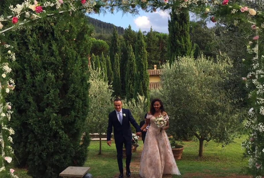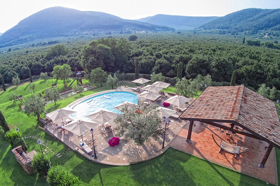 Residenza di Rocca Romana offers an authentic Italian countryside wedding just 45 minutes from Rome, nestled within the protected Bracciano and Martignano Natural Park near Lake Bracciano. This private stone hamlet spans 4 acres of flowered gardens shaded by ancient trees, with stunning views of the Sabatini Mountains creating a cinematic backdrop for your celebration.