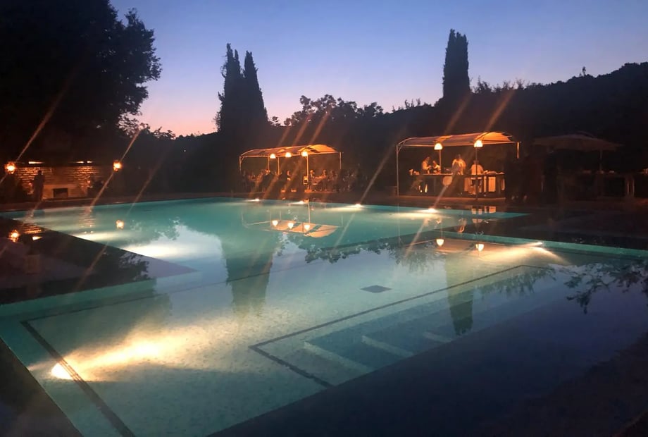 Imagine your ceremony in a natural amphitheatre or floral arch among the woods, followed by poolside aperitifs at the impressive infinity pool that resembles a serene mountain lake. The estate flows effortlessly from outdoor receptions under elegant pergolas to candlelit dinners by the water, then dancing into the night. UK and Northern European couples love this setup: no city hustle, just nature, warm Italian hospitality, and space for 50-150 guests to relax together.