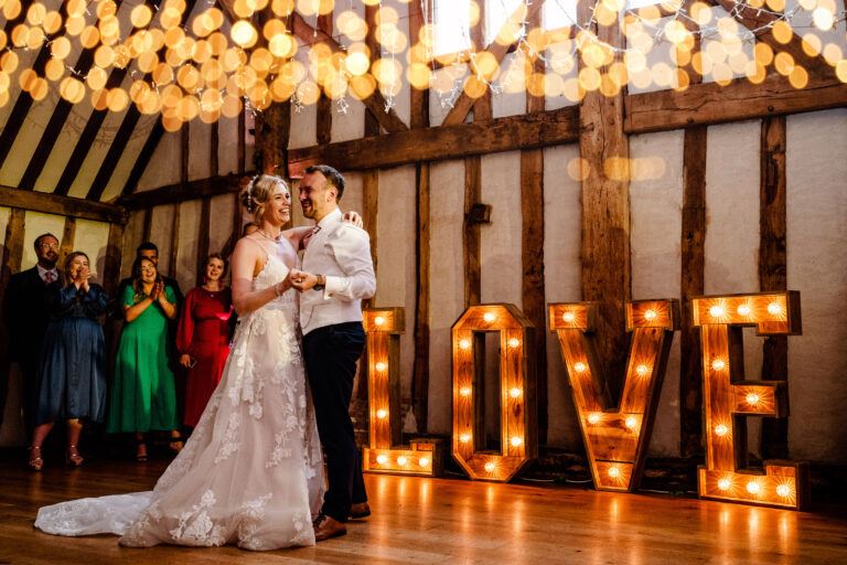 Celebrate the theme of love with a large LOVE sign at the entrance to your reception, or in your ballroom as a romantic backdrop to your first dance. We love this dreamy shot, captured by Anesta Broad Photography, of the happy couple dancing: “It’s the happiness of the couple, the delight of the guests in the background and the beautiful setting at Blake Hall that makes this photo feel special. It is a beautiful moment.” For something more subtle, consider dotting some smaller signs around your venue, like near the bar or the sign-in table, featuring romantic love-inspired quotes.