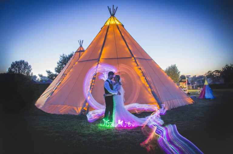 Work with your photographer, or a lighting company, to create romantic shapes with light (whether outside, or as a dramatic ceiling pattern). This shot by Jennifer West Photography is particularly striking and romantic. We love the multi-coloured neon sign and heart-shaped light trails. According to the photographer: “The evening was warm and balmy and as the music filled the air, Luke and Kirsty say it was one of the most special memories of their wedding.”