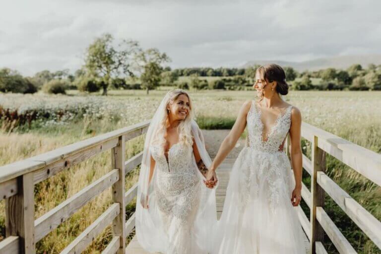 Brides can’t go wrong with a floaty, lace-layered wedding dress. Opt for a champagne or pink-toned dress for a subtle twist on the classic white. Pair it with a floral crown made of wildflowers to embrace the natural beauty of the setting. Complete the look with dainty, vintage-inspired jewellery and a pair of charming cowgirl boots for that perfect blend of elegance and rustic charm.