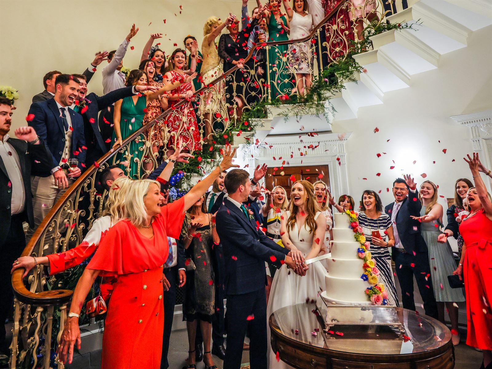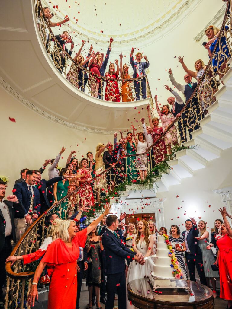 Why we chose this photo as our overall winner: What a vibrant and joyful photo! This is what cake moments are all about – cake, colour, confetti, celebration! There is a real party atmosphere, from the couple’s laughter to the guests’ cheering. We love the composition with the guests winding up the spiral staircase, showering the couple below with confetti. And the cake itself is incredible – towering and beautifully decorated. This may be a staged shot, but the reactions of the couple and their loved ones give it a wonderfully candid and natural feel.