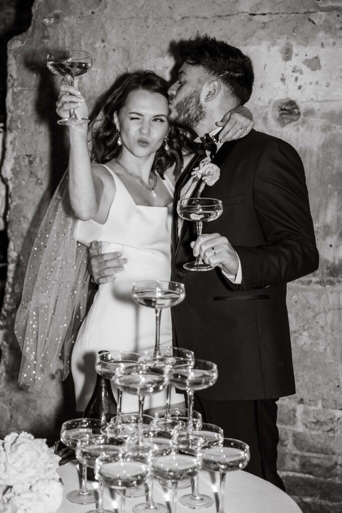 Why we shortlisted this photo: For a TikTok trend (check out the hashtag #champagnetower, with its 40 million views), this photo has such a timeless, classic feel due to being shot in black and white. The bride’s expression adds a fun, modern touch to this impressive shot.