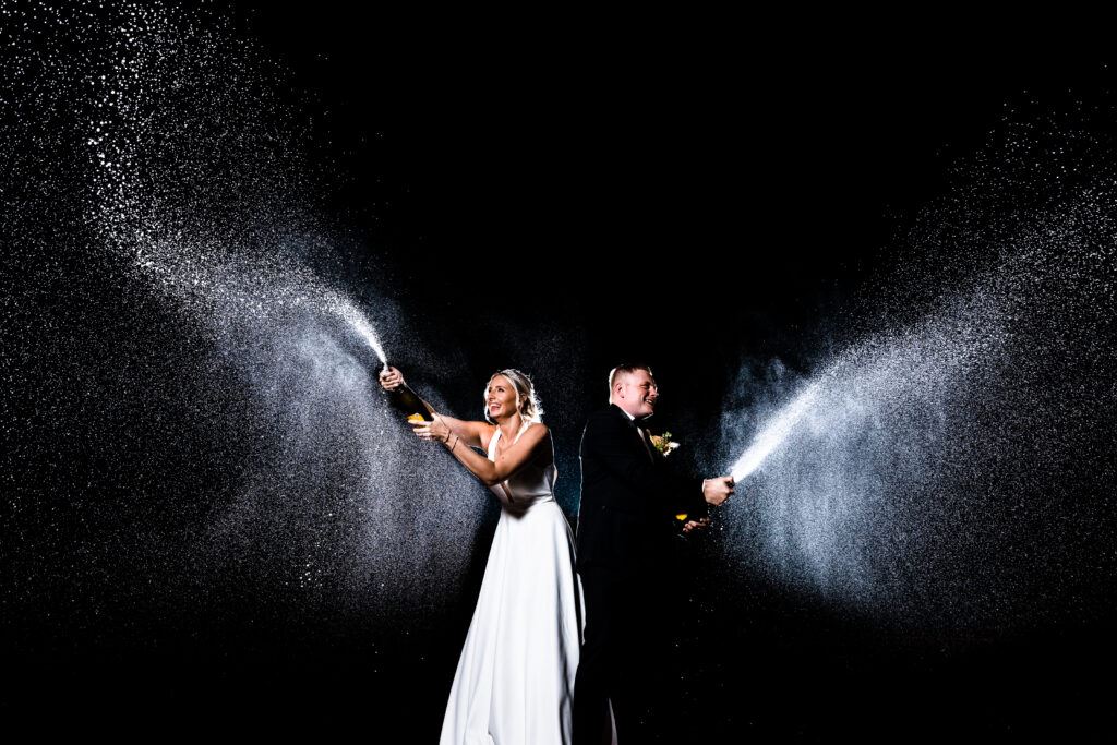 The story behind this photo: “Shauna and Tom wanted something a little bit different and fun for their night portrait at The Old Kent Barn and you can’t beat a champagne spray!”