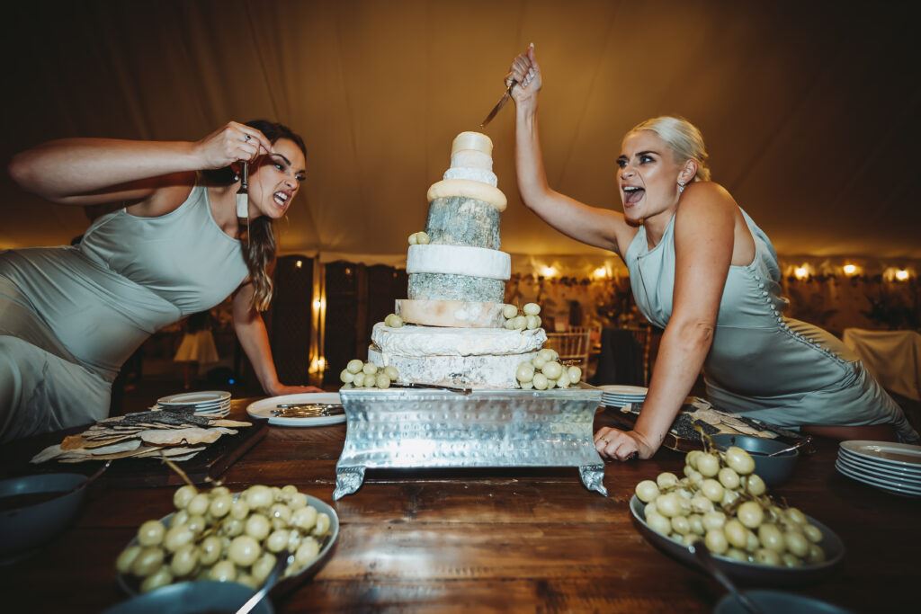 The story behind this photo: “The less traditional cheese wedding cake being attacked by the bridesmaids…”