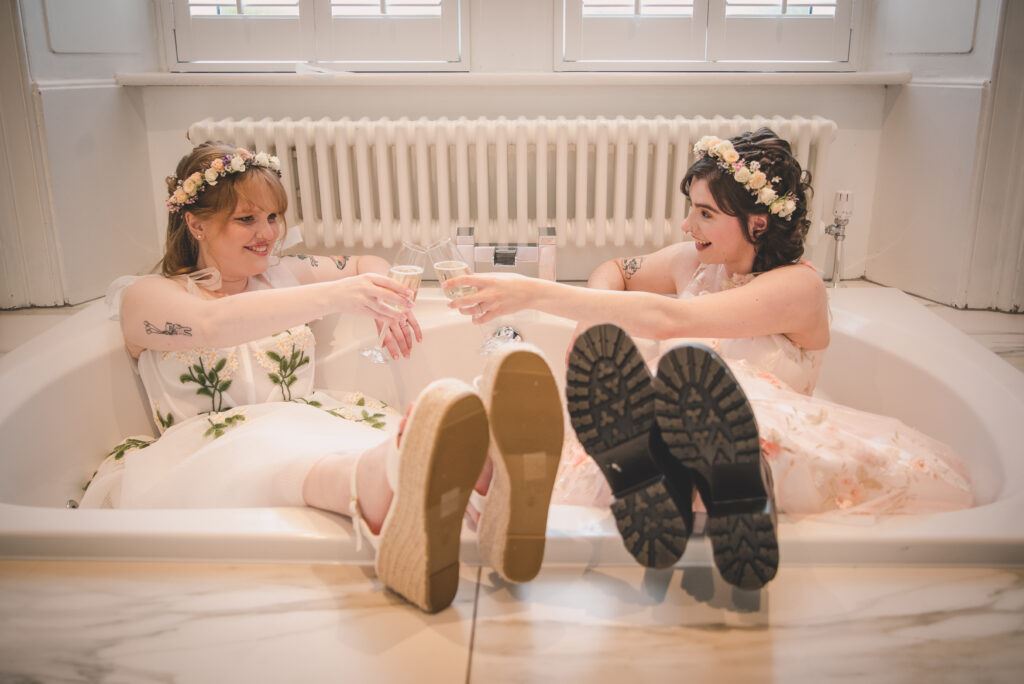 Why we shortlisted this photo: This is such a sweet and intimate champagne moment. We love the way the brides are looking at each other, and kicking their feet up to relax in the tub.