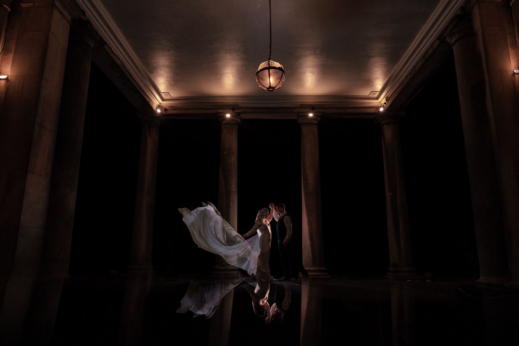 The story behind this photo: “This was captured at Prestwold Hall, the couple are Chris and Michelle. The image was lit behind with two flashes to capture the movement and a bridesmaid was camera left in the shadows throwing the dress and veil. I really wanted to use the epic entrance vertical lines in contrast to the drama of a first dance, and the movement of the dress just works so well. Two or three attempts and we had it, and a very giggly bridesmaid!”