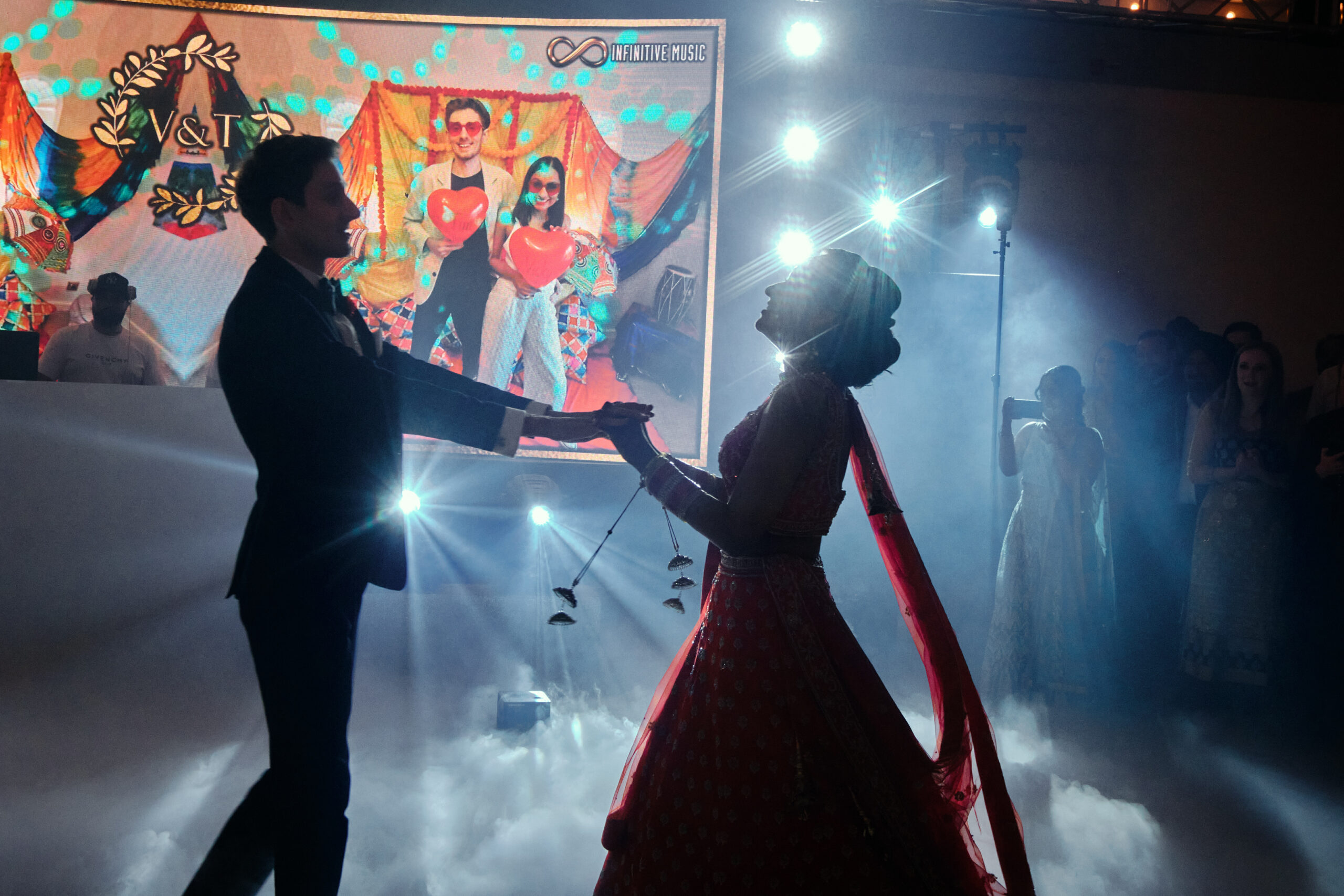 Why we shortlisted this photo: This photo combines theatre with intimacy. Silhouetted figures, spotlights and smoke contrast with joyful expressions, clasped hands, and the very personal touch of having their colourful engagement photo hanging behind them.