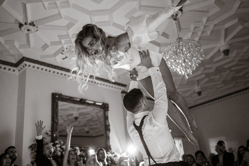 Why we shortlisted this photo: We love the feeling of freedom captured in this photo, as the bride soars in her partner’s uplifted arms. The use of greyscale adds a measure of sophistication, which contrasts beautifully with the light-heartedness of the pose itself.
