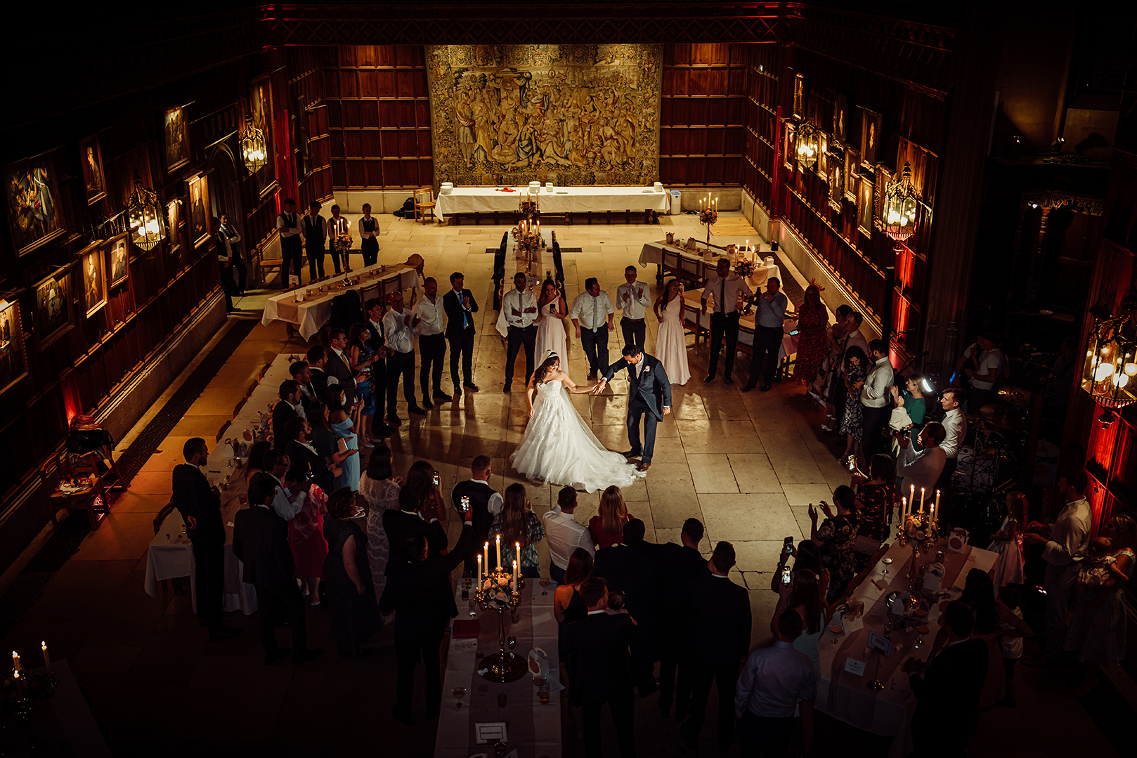 Why we shortlisted this photo: This photo has the feeling of a painting, which gives it a majestic and impressive quality. We love the artful perspective from the gallery, with the couple in the spotlight in the centre and the guests surrounding them in a perfect circle.