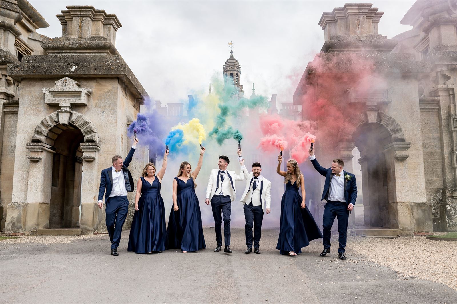 The story behind this photo: “The couple wanted to do a smoke bomb shot with pride flag colours with their wedding party in front of Harlaxton Manor to celebrate Harlaxton manors first gay wedding.”