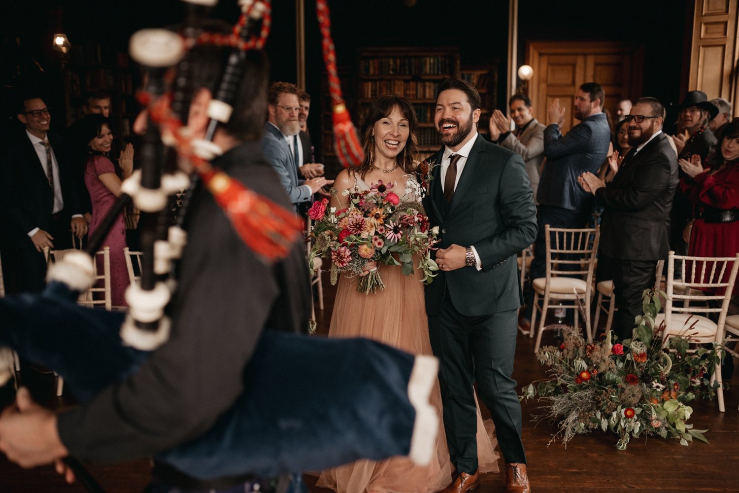 Rust hues – in the form of orange flowers, autumnal leaves, pampas grass and dried foliage – which people tend to go for in September-November weddings