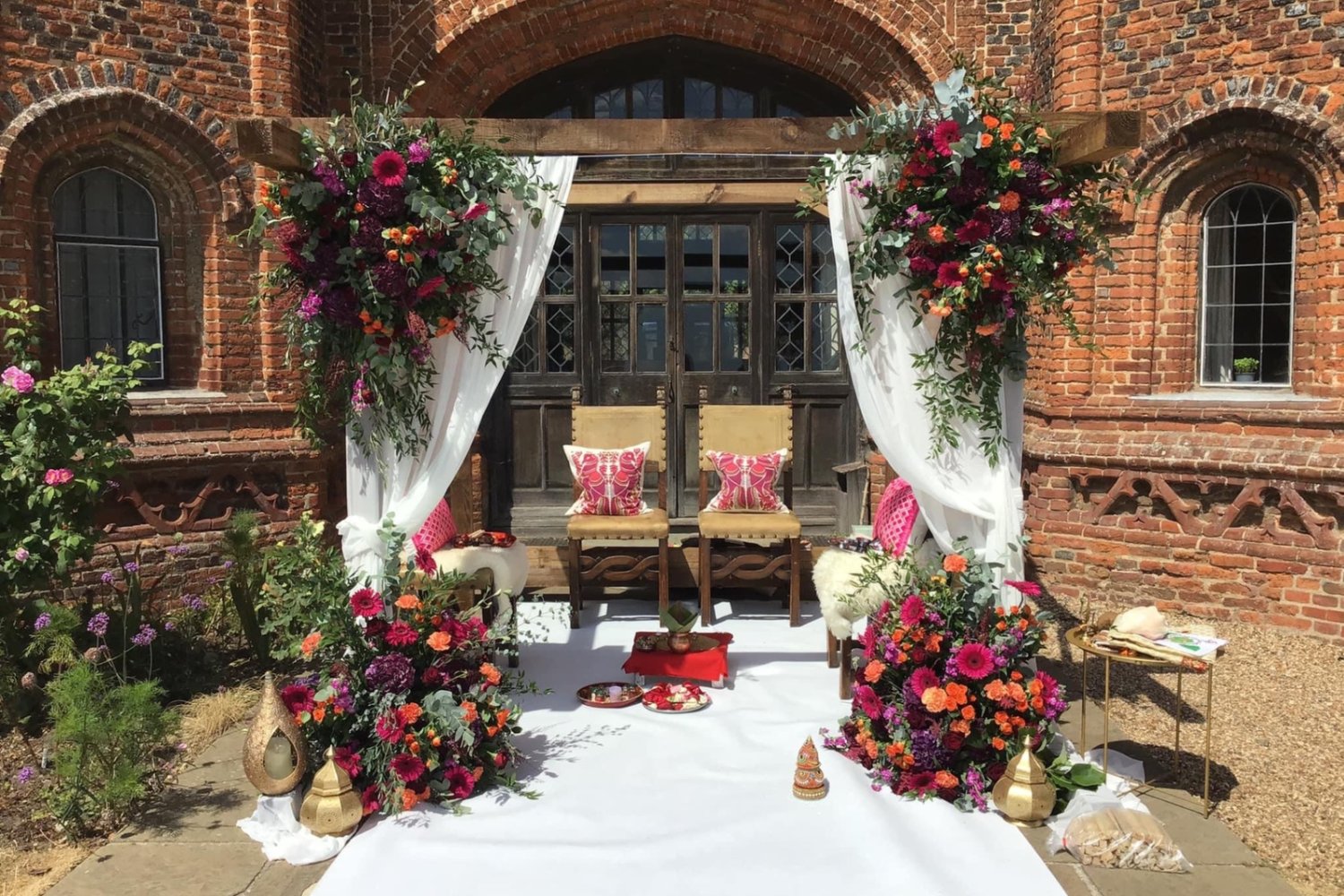 Flower-topped pillars on either side of the table