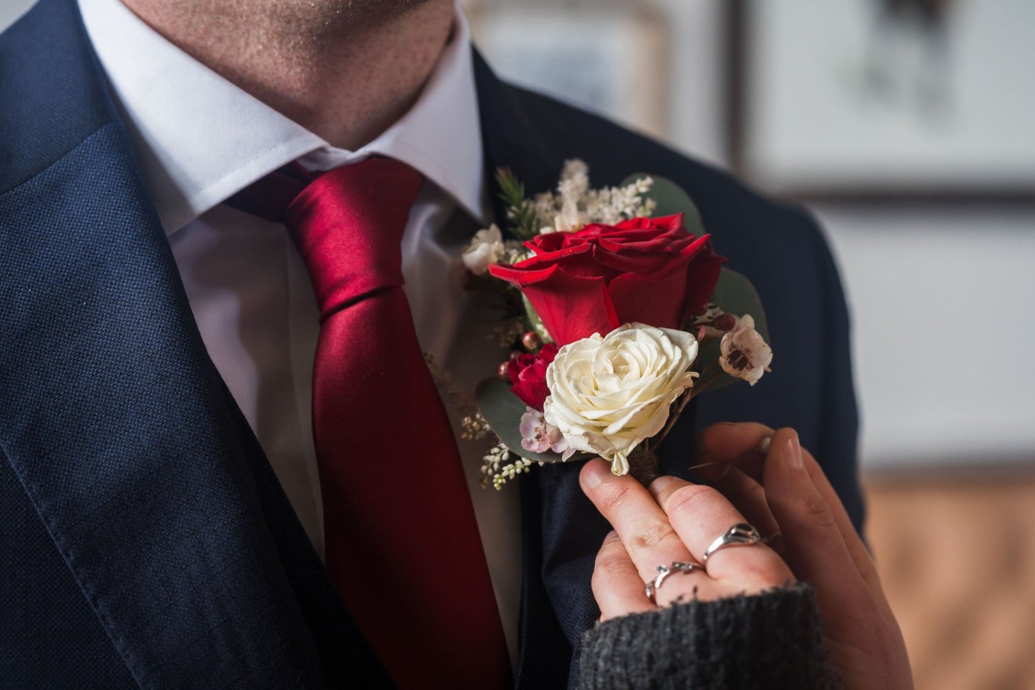 Christmas florals – think poinsettia, red roses, white anemones, snowdrops, frosted eucalyptus, pinecones, holly, red berries and plenty of ivy