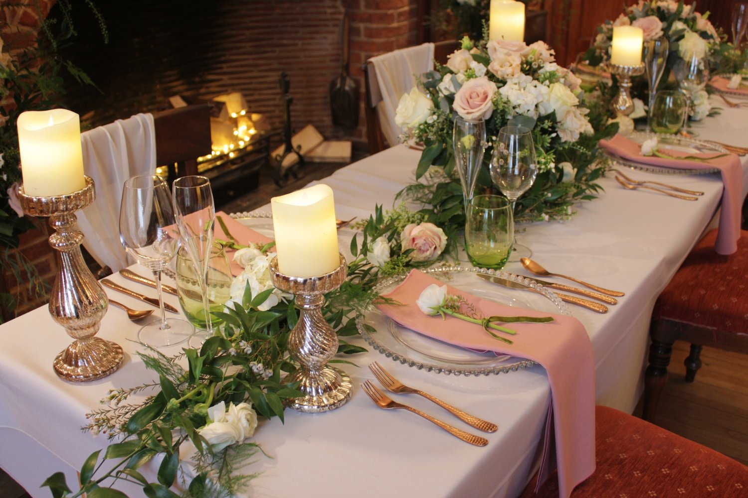 Arrangements that line the bottom of the table – you can either then match this with the florals on the top of the table, or simply place rows of candles above