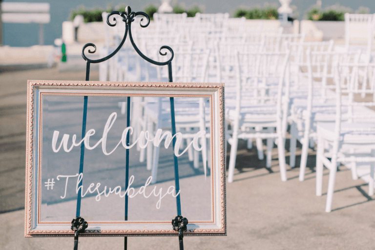Start by sourcing some reclaimed wood or wooden pallets. You can often find these at salvage yards or home improvement stores. Then, get crafty with stencils, paint, or wood-burning tools to add your names, wedding date, or meaningful quotes. You can include any information you’d like. For example, a welcome message, a seating plan, or an order of service.